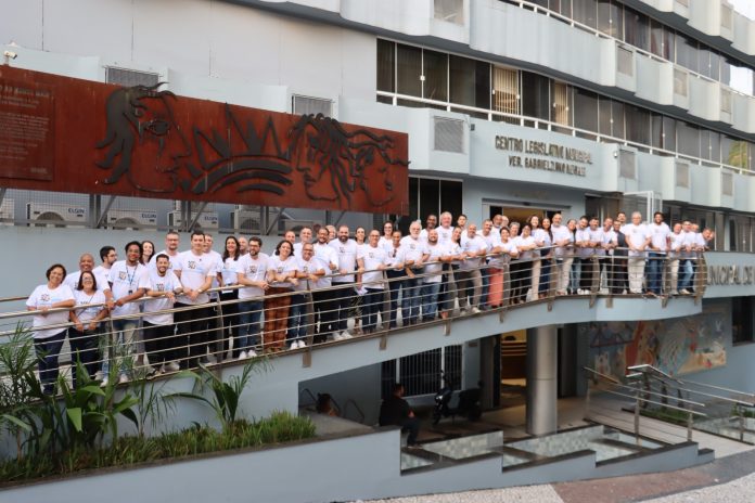 Antes do prolongamento da sessão, parlamentares e servidores se reuniram em frente à sede da Câmara para registrar a foto oficial que marca o início das celebrações. O ato reuniu equipes administrativas e legislativas, ladeadas pelo presidente da Casa, João Cobalchini, simbolizando a união institucional em torno da data histórica.