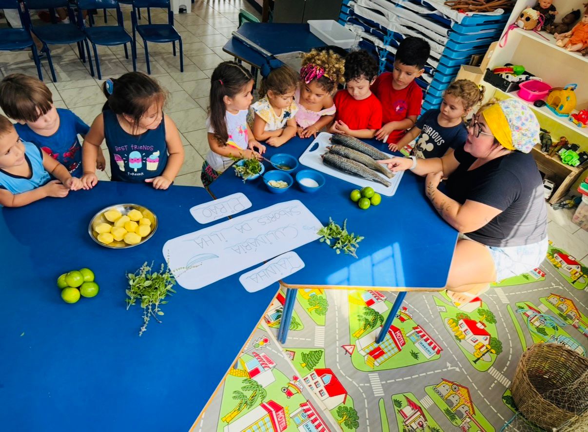 A atividade envolveu todas as etapas — da observação ao preparo. As crianças ajudaram a temperar o peixe e acompanharam o processo até a degustação, tornando-se protagonistas da própria experiência.